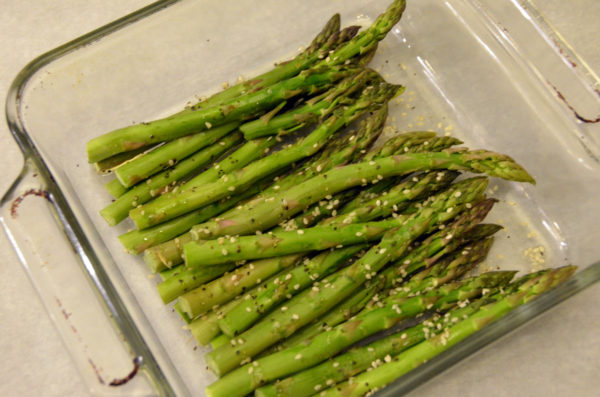 5. Place trimmed asparagus in a baking dish and drizzle with sesame oil, sea salt and sesame seeds
