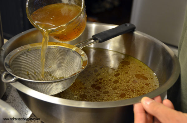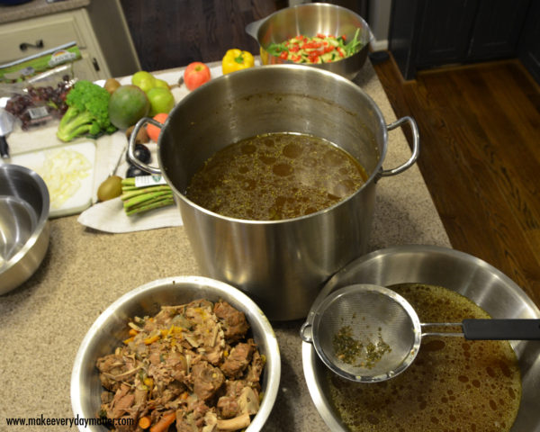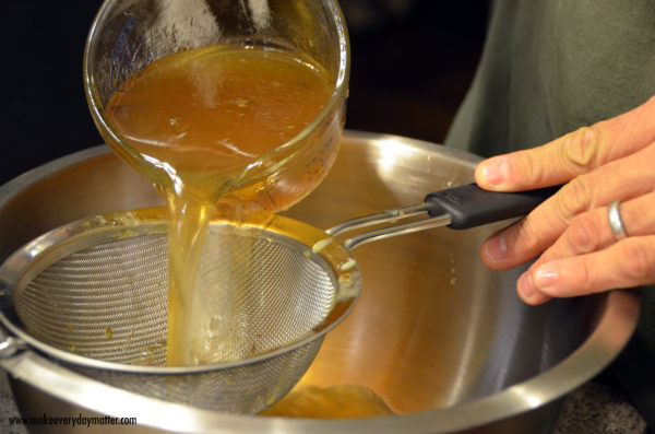 - Remove bones, meat, herbs and vegetables and discard or do as you wish with them.