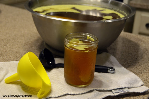 Storage. This is up to you. You can do traditional canning methods for shelf stable storage or you can freeze in zip lock bags or mason jars. I’ll go over the basics of storing in mason jars but please know you can find a lot of great information online if you really want to study up. You will want to purchase FREEZER SAFE WIDE MOUTH mason jars (these are thicker and have no “shoulder” which cracks when the liquid freezes/expands).I prefer the Ball brand. Fill each one with the stock until about ¼” below the freezer fill line. Return to the fridge to get cold again and do not put the lid on. After they are chilled transfer the jars to the freezer and again do NOT put the lid on. Let them freeze solid (approx. 18 hours) and then put the lid on. They will be nice and happy in the freezer for up to 6 months.