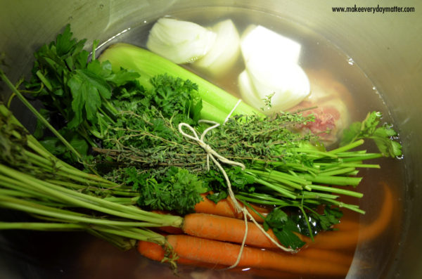 - Add carrots, celery, onions and half of the parsley & thyme (I like to tie my herbs in a bundle with cooking twine) and fill the pot 2" from the top.
