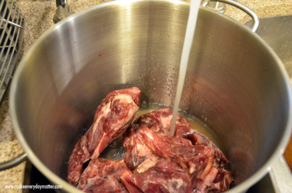 - Put the bones in a large stock pot, add the vinegar then fill the pot with water until the bones are just covered. Soak for 1 hour. This step helps draw the nutrients from the bones. I start with frozen bones but you can thaw them first, especially if you plan to roast them {that makes a darker stock with a more roasted flavor}