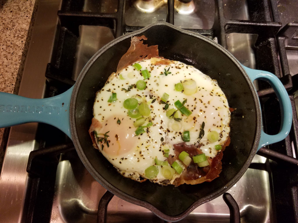 3. Crack two eggs on top of prosciutto, sprinkle with fresh black pepper, chives and herbs. Cover and let cook 3-5 minutes or until eggs are done to your liking