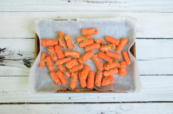5. Line a small baking sheet with parchment paper and arrange carrots in a single layer