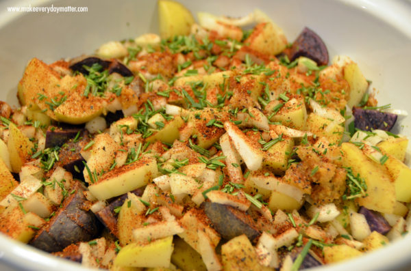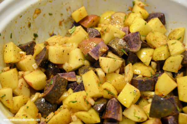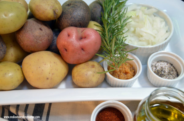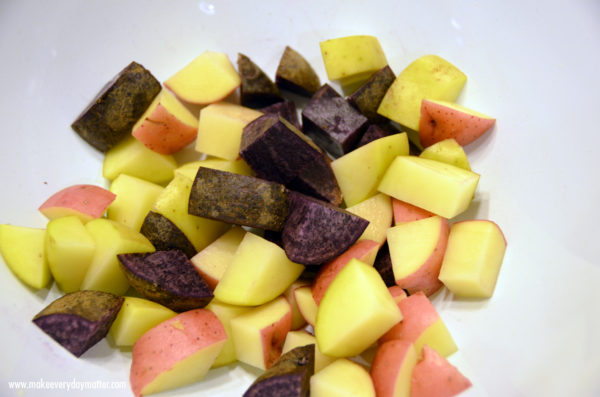 • 3 pounds Potatoes-small I prefer a medley of gold, red and purple potatoes and ALWAYS go with organic/non-GMO spuds please!