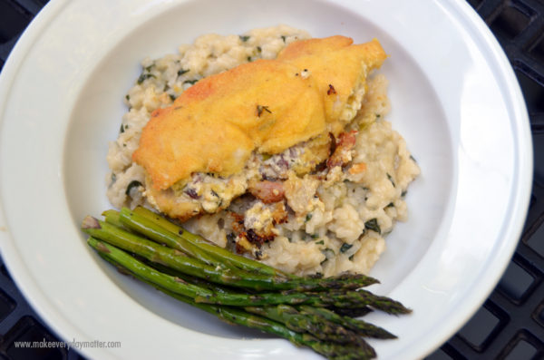 Think of this as a Chicken Cordon Blue type recipe, kicked up to a heavenly level that will leave your taste buds dancing.  It’s actually a simple recipe with minimum prep time despite how “gourmet” it looks and it’s very allergen friendly should you be looking for something indulgent despite restrictions you may have.  Oh and it is even more delicious served over a bed of cream dreamy spinach risotto made with lamb stock!