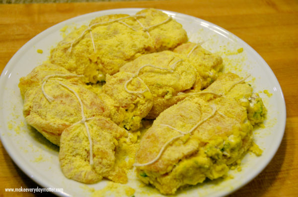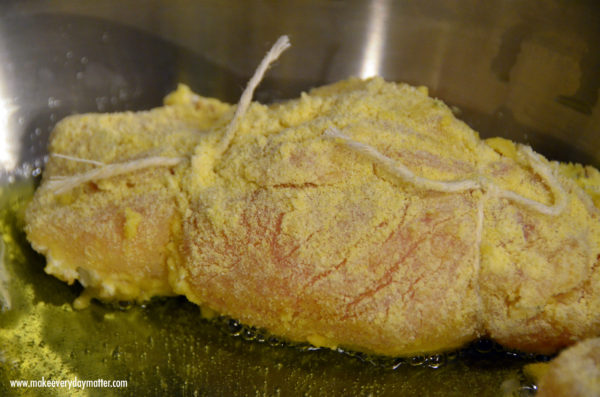 7. Gently roll the chicken breast in the cornmeal. You can further "seal" the pocket by pressing that edge of the chicken in to the cornmeal.