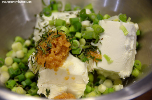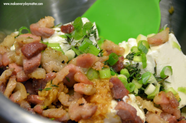 3. While the pancetta is frying add the goat cheese, green onions, garlic and thyme to a medium bowl.