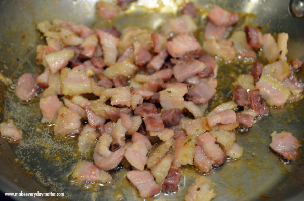 2. Fry pancetta until it's golden brown on the edges, approx 6-8 minutes. Let cool 5 minutes.